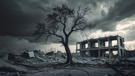 AI Generated. Desolation and Resilience A Lone Tree Stands Amidst the Ruins of a Destroyed Building Under a Dramatic Sky