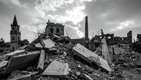 A desolate war-torn landscape with ruined buildings, rubble, and a dark stormy sky, depicting the aftermath of destruction and tragedy.