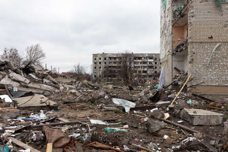 BORODYANKA, UKRAINE - APR. 06, 2022: War in Ukraine. Chaos and devastation on the streets of Borodyanka as a result of the attack of Russian invaders