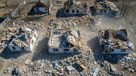 An aerial view captures multiple residential houses heavily damaged and destroyed, with extensive rubble and debris scattered across the scene.