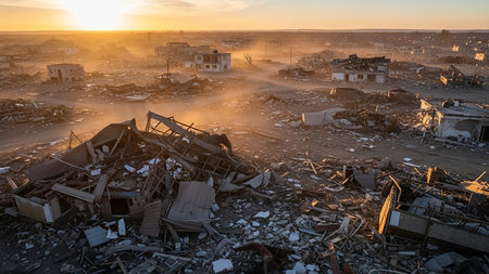 An aerial perspective of a residential area reduced to ruins, with destroyed houses and scattered debris under a hazy, atmospheric sunset.