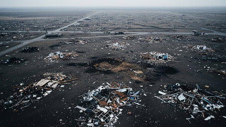Desolate landscape reveals shattered structures and debris, remnants of a recent natural disaster.