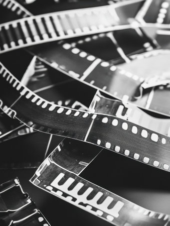 Scattered black and white film strips reveal various frames, highlighting the artistry and nostalgia of retro photography from a bygone era.