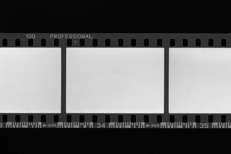 Professional black and white film strip with blank white frames, ready for displaying copy space.