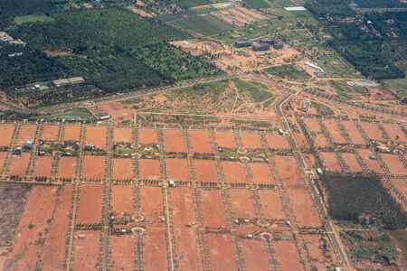 Top view of the village. One can see the roofs of the houses and gardens. Road the village. Village bird's-eye view.