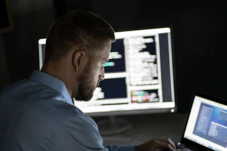 Handsome young programmer working at home late in evening