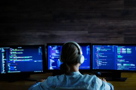 Software developer freelancer man male with white headphones working with program code: C++, Java, Javascript on wide displays at night. Develops new web, desktop, mobile application or framework.