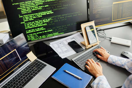 Programmer working on laptop at workplace. Programmer programming code on computer. Software development.