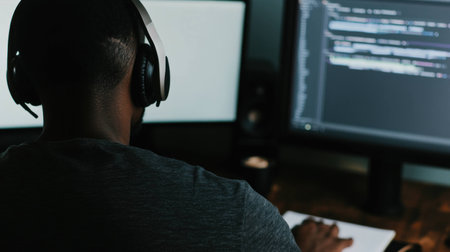 Focused male programmer working with dual monitors in a tech environment, wearing headphones, showcasing concentration in a dark themed workspace