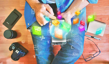 close up of hand using mobile payments online shopping,omni channel,in modern office wooden desk,icons graphic interface screen,eyeglass,filter,black white