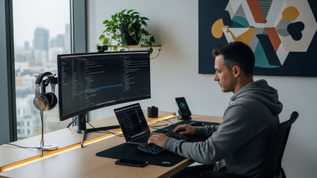 A focused individual is working on a laptop and a desktop computer in a modern office setting. The workspace includes dual monitors, a mechanical keyboard, and a headset.