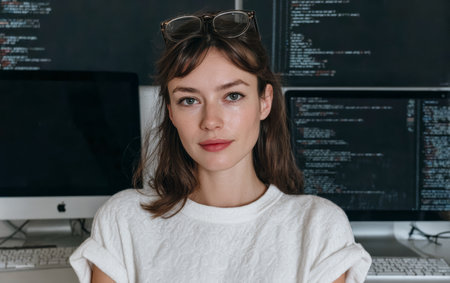 A young woman sits at a desk in an office. She focuses on her work in front of multiple computer screens. The screens show lines of code in a bright workspace, reflecting a tech environment.