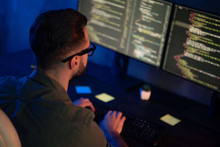 Programmer working on computer in dark room. Programmer coding code on desktop computer.