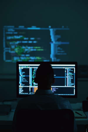 Rear view of computer hacker sitting and reading a computer code reflecting on his back