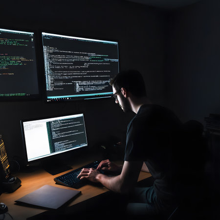 A person is focused on coding in a dimly lit environment, surrounded by glowing screens displaying code.