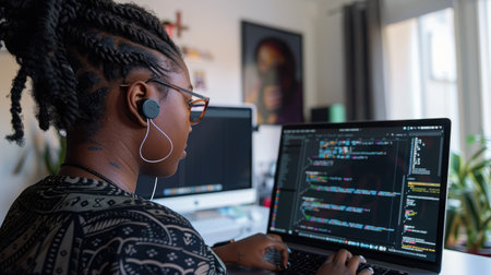 African American woman focused on programming, coding on her laptop in a well-lit office space, showcasing diversity in the tech industry.