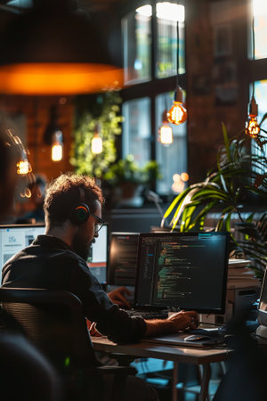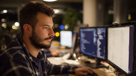 Focused Software Developer Analyzing Code on Computer Monitors Late at Night in the Office