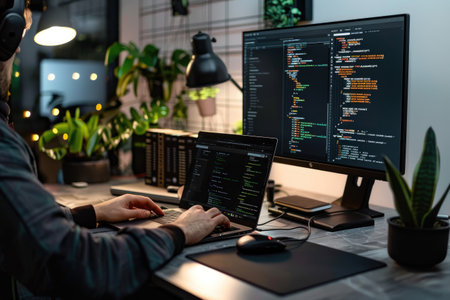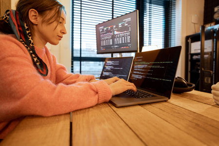 Woman writing programming code on laptops and desktop computer at cozy home workplace. Concept of remote programmer work at home