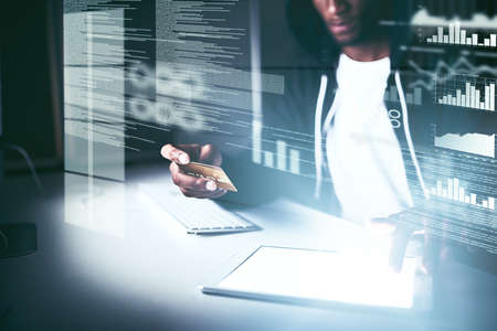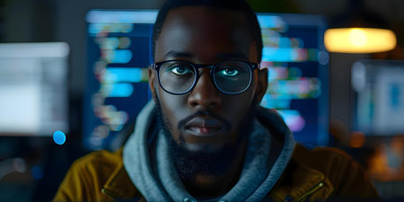 Silhouette of a young African American man deeply focused on coding or programming on multiple computer screens in a dark neon lit office or technology workspace setting Concept of technology