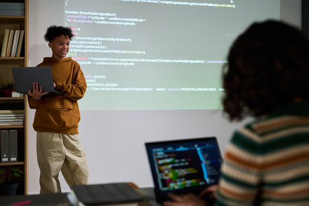 Teenage boy standing and presenting with laptop in hand in front of projected code, while young adult woman with curly hair sitting and typing on laptop in foreground