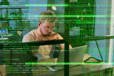 Double exposure of thoughtful male programmer at workplace and computer code