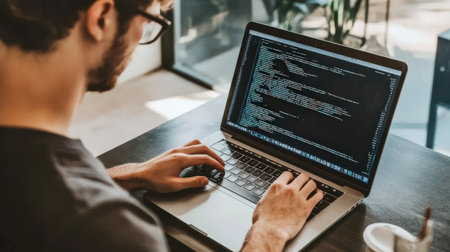 Dedicated software developer intensely works on fixing bugs, typing on a laptop at a wooden desk, with a coffee mug nearby for concentration