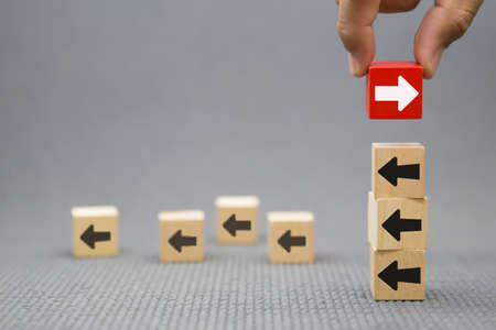 Wooden toy blocks stacked with arrow icon pointing to opposite directions for way of business change.