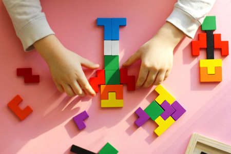 educational toys for children, child folds colorful wooden blocks. top view