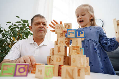 Grandfather and granddaughter playing wooden cubes in living room