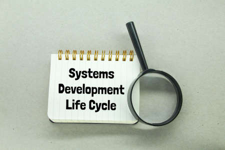 magnifying glass and notebooks with the words systems development life cycle