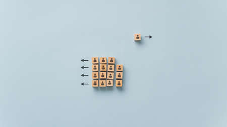 Conceptual image of uniqueness and individuality - wooden block with person icon on it going the other way than a group of them.
