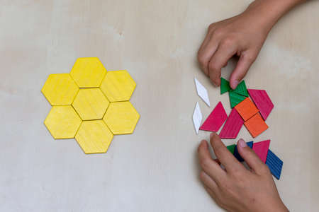 Tangram hexagon flower colored child geometric puzzle piece with childs hands moving pieces.