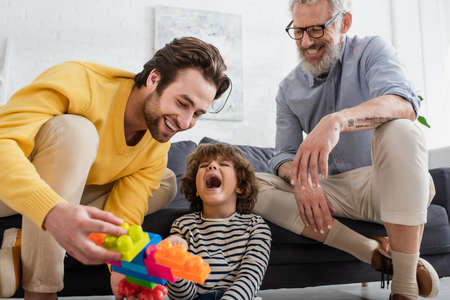 Excited boy sitting near smiling parents with blurred building blocks at home