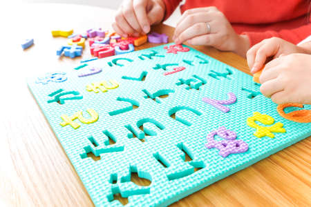 Children's hands assemble letters from colored plasticine. The development of fine motor skills.