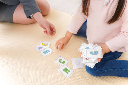 Cropped image of young mother and daughter playing with game cards at home