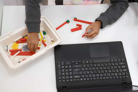 Kids learning coding, science and technology at school class. African American and Caucasian children studding with laptop computers on STEM lesson. Diversity in modern education. Top view closeup