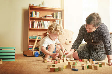 Play is a vital way of learning. Shot of a mother and her little son playing with wooden blocks at home.