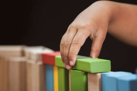 Focus on child's hand playing with colorful wooden blocks in vintage color tone
