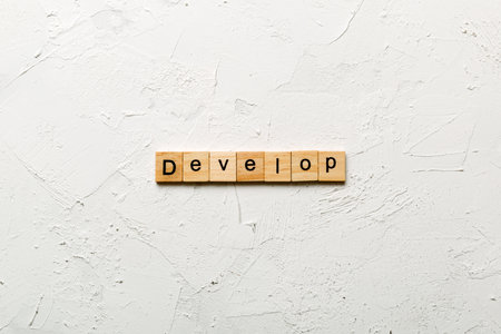 Develop word written on wood block. Develop text on cement table for your design, concept.