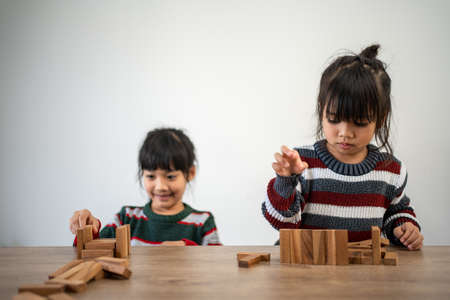 Asian portrait, grandchild granddaughter grandma grandmother and granddaughter happily join in activities to Block wood game Puzzle and enhance skills for grandchildren.