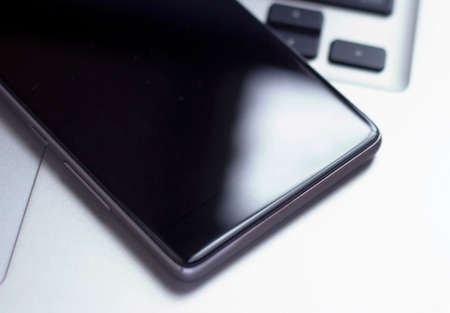 Hand hold mobil phone blank person smartphone cell. Hand woman work using laptop, remote worker quarantine