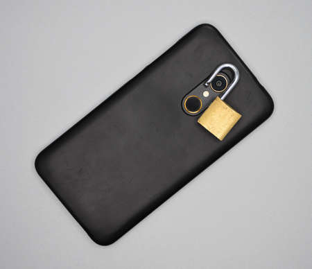 Padlock on the top of a mobile phone isolated on white. View from above. Data security concept.