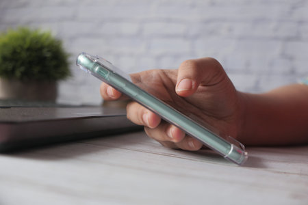 A programmer is browsing the Internet in smart phone to protect a cyber security from hacker attacks and save clients confidential data. Padlock Hologram icons over the typing hands.