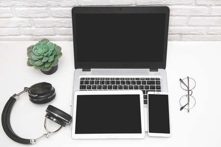 Tablet, phone and laptop with empty screen, designer tools on table in workshop. Photo for blog about design or ad