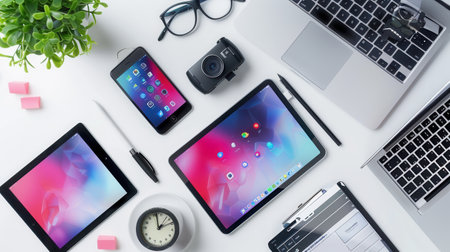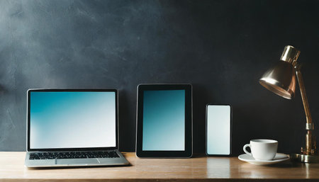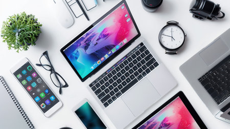 A sleek desk with a laptop, tablet, and smartphone showcasing vibrant apps and work processes. Perfect for IT companies and electronics manufacturers.