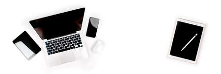 Office table with digital tablet, smartphone and pencil on isolated pure white background / Laptop and tablet mockup concept. (Selective Focus)