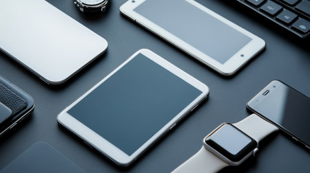A table filled with an array of diverse electronic devices, Grid-style layout of various smart devices in a minimalist design, AI Generated
