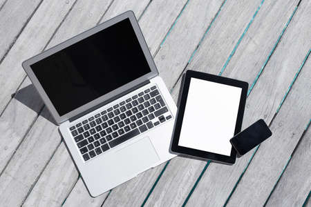 Tech gadgets on wooden deck