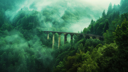 This captivating image features a misty landscape with a bridge spanning calm water, nestled among lush forests and majestic mountains, evoking a sense of tranquility.