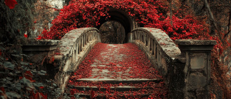 Secluded bridge draped in vibrant red ivy surrounded by nature’s quiet charm